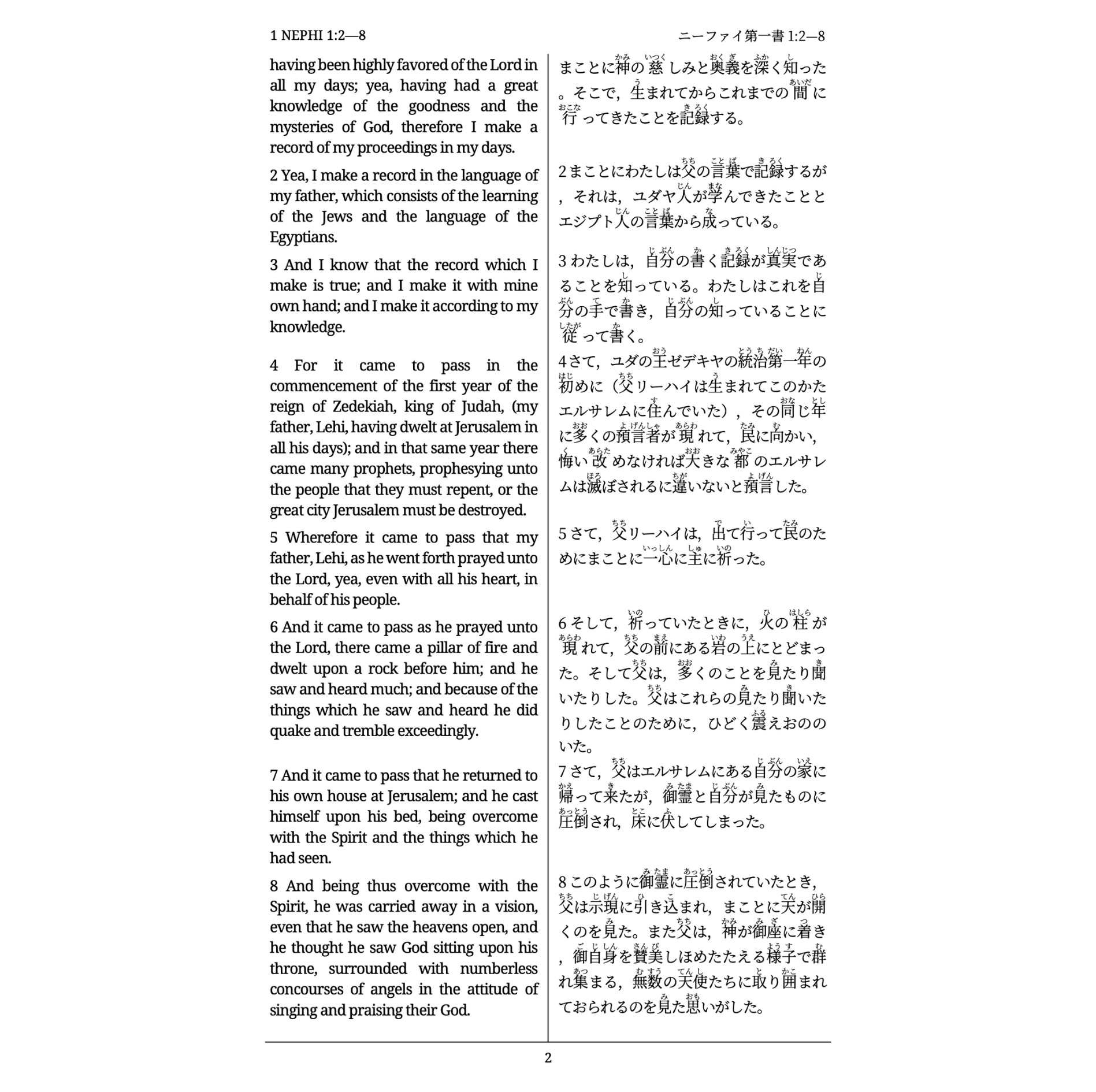 Discover the enriching experience of studying the Book of Mormon in two languages with Native Scripture's English-Japanese edition. This unique volume features English text in the left column and Japanese text in the right column, allowing you to read and understand the scriptures verse by verse in both languages.